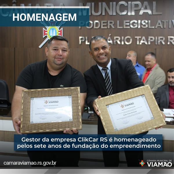 Na sessão plenária da última quinta-feira (19), o vereador Armando Azambuja (PSDB) entregou, na Câmara Municipal de Viamão (CMV), um diploma de parabenização, reconhecimento e aplausos à empresa ClikCar RS, especializada no segmento de locação de veículos, em comemoração aos seus sete anos de fundação. A homenagem também foi destinada ao gestor da empresa, Paulo Victor de Souza Barbosa, em reconhecimento à sua liderança e contribuição para o desenvolvimento econômico local.