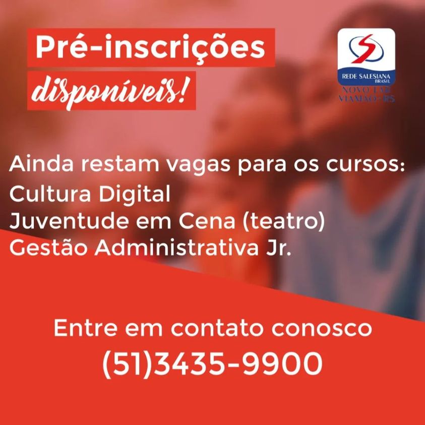 As pré-inscrições vão até o dia 31 de março e podem ser realizadas através do preenchimento do formulário online. O horário de atendimento pela manhã é das 08:00 até as 11:30h. No período da tarde o atendimento é feito das 13h30 até as 16h30, para mais informações entre em contato através dos números: (51) 9 9533-2498, (51) 3435-9900.