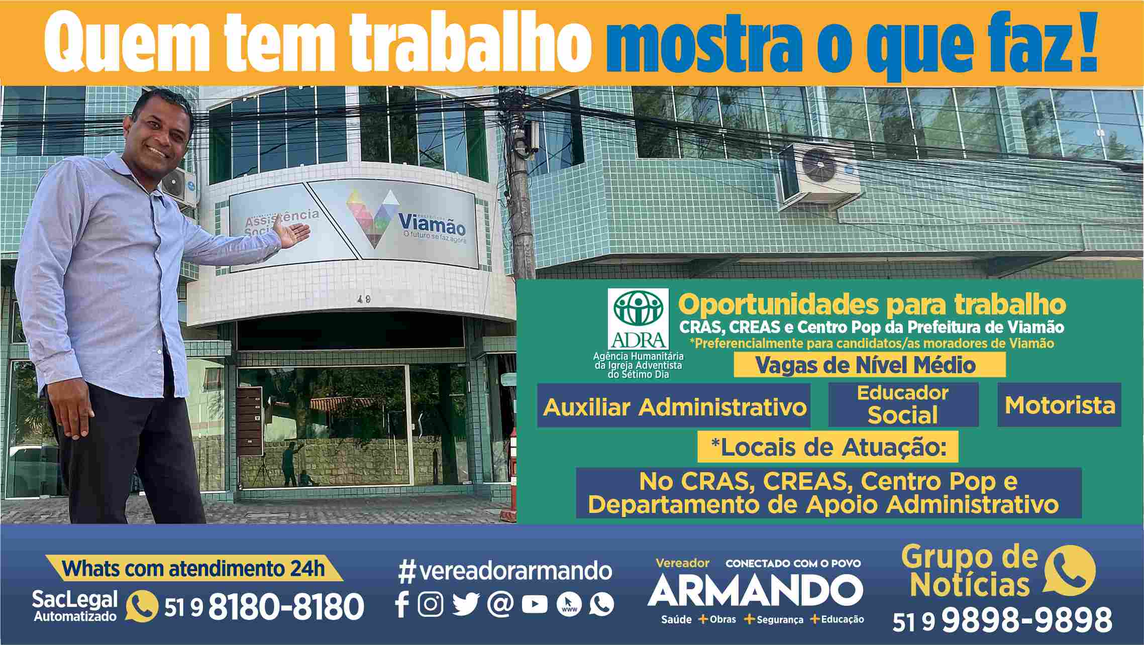 O presidente da Câmara de Viamão, vereador Luís Armando Azambuja (PSDB), destacou que a gestão do prefeito professor Bonatto, nas políticas do Gabinete Integradopara o Cuidado com as Pessoas – GIP, e buscando a manutenção dos trabalhos e ações na Secretaria de Assistência Social, esta realizando a contratação de 98 vagas de emprego para 12 diferentes tipos de cargos, em nível médio e superior, através da das ADRA – Agência Humanitária da Igreja Adventista do Sétimo Dia.