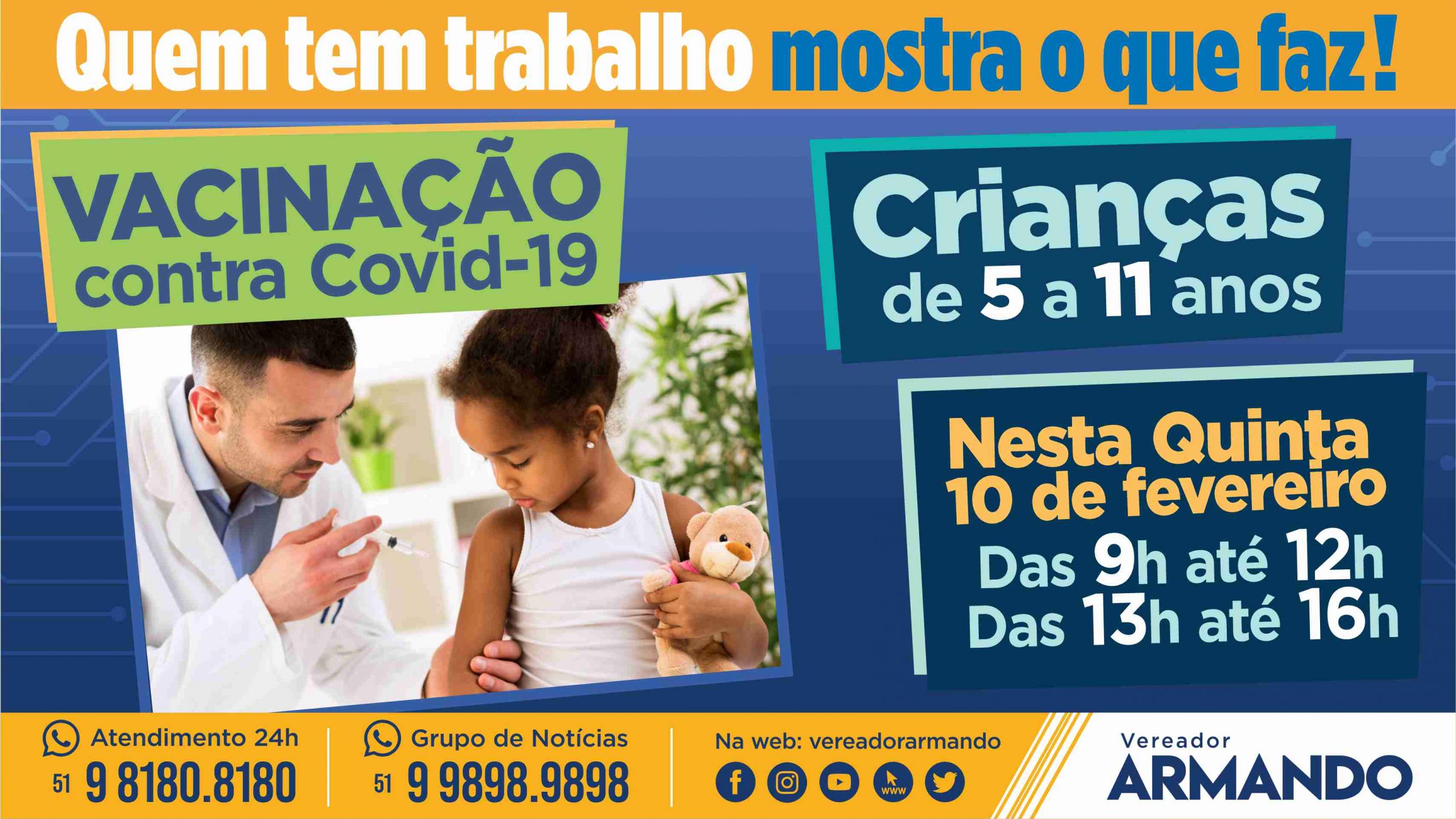 O vereador, Luís Armando Azambuja (PSDB), destacou que nesta quinta-feira, dia 10 de fevereiro, com a gestão na Prefeitura de Viamão, liderada pelo prefeito e secretário de saúde, professor Valdir Bonatto, avançaremos ainda mais, na vacinação contra a Covid-19. Destaco, que hoje é a vez das crianças de 5 a 11 anos de idade!