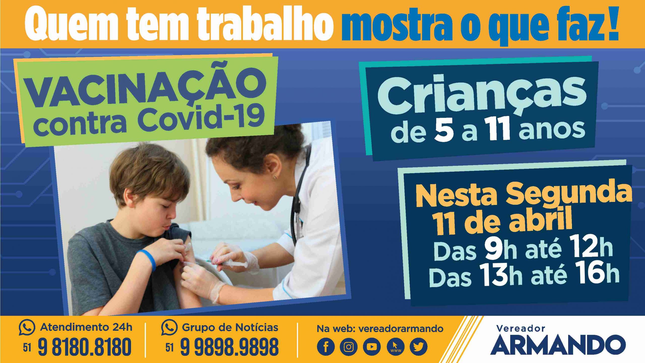 O vereador, Luís Armando Azambuja (PSDB), destacou que nesta segunda-feira, dia 11 de abril, com a gestão na Prefeitura de Viamão, liderada pelo prefeito e secretário de saúde, professor Valdir Bonatto, avançaremos ainda mais, na vacinação contra a Covid-19. Destaco, que hoje é a vez das crianças de 5 a 11 anos de idade!