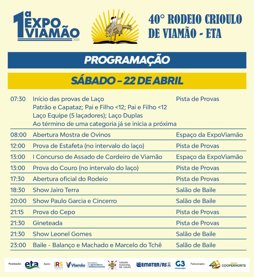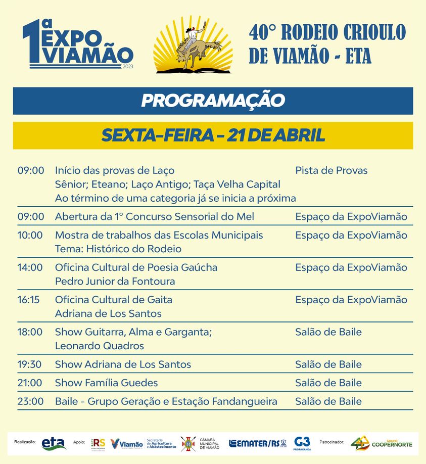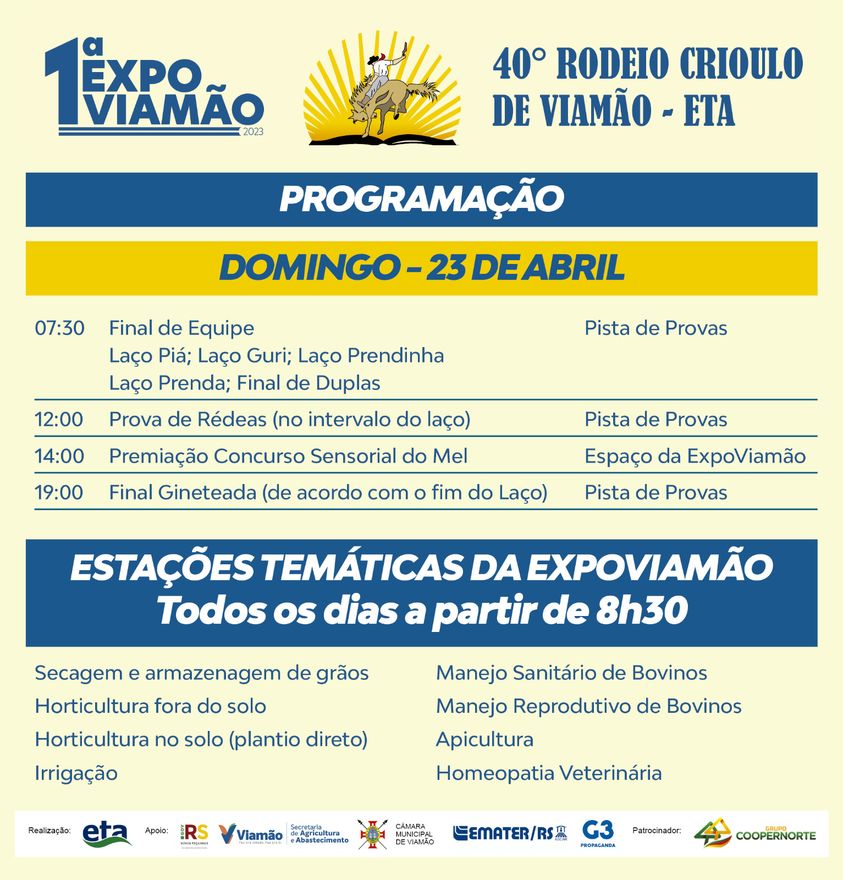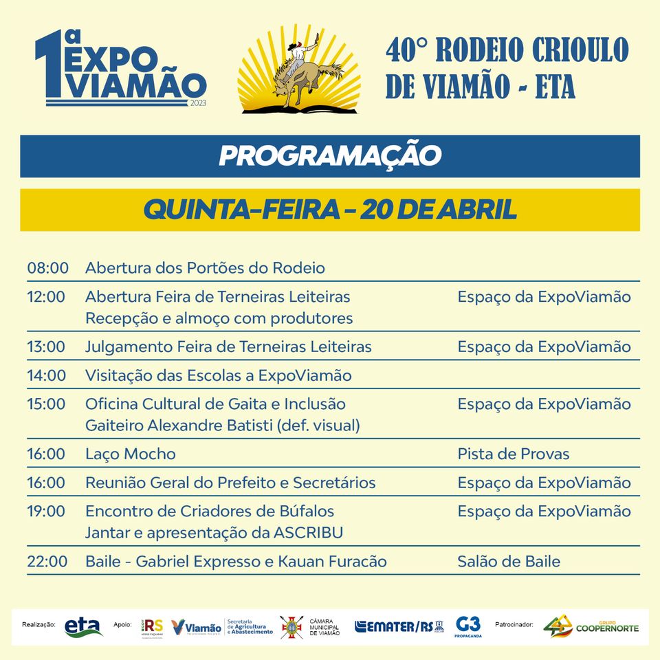 A realização do 40º Rodeio Crioulo de Viamão, é da Prefeitura de Viamão e da Escola Técnica de Agricultura – ETA, com apoio do Governo do Estado, Emater, Câmara de Vereadores e G3 Propaganda e patrocínio da Coopernorte.