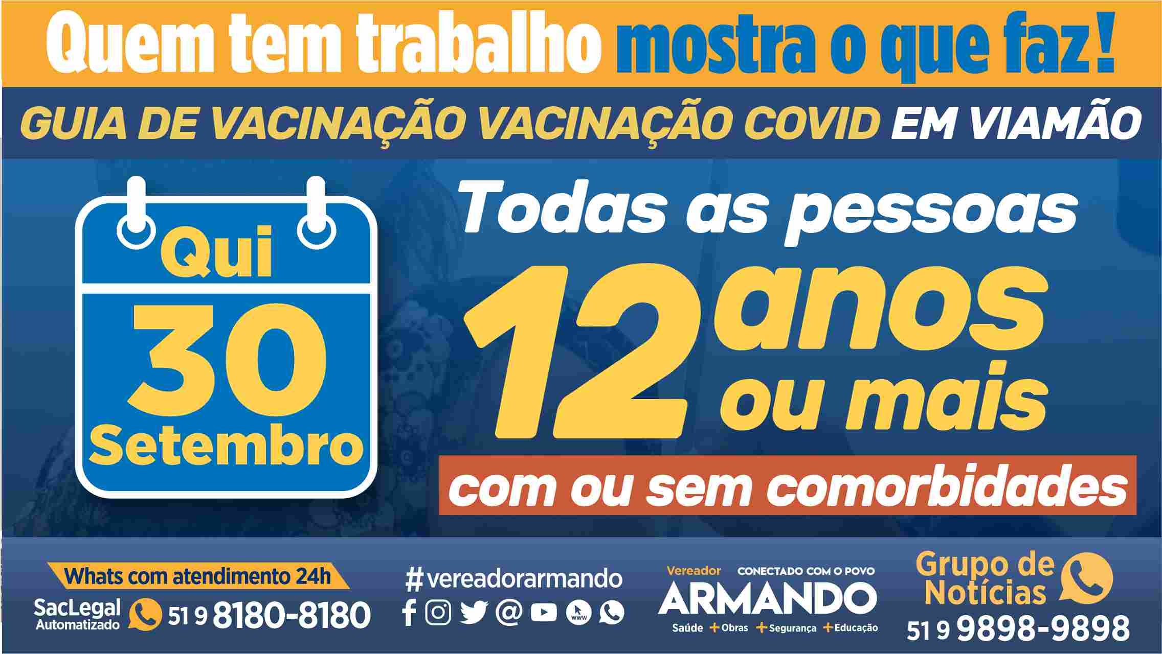 Destaco, que nesta quinta-feira, dia 30 de setembro, é a vez das pessoas de 12 anos ou mais, que podem ir até uma das 18 Unidades de Saúde de Viamão (US Centro está fechada para reforma), para tomar a primeira dose da vacina, que estão abertas, das 8 às 17 horas, para vacinação.