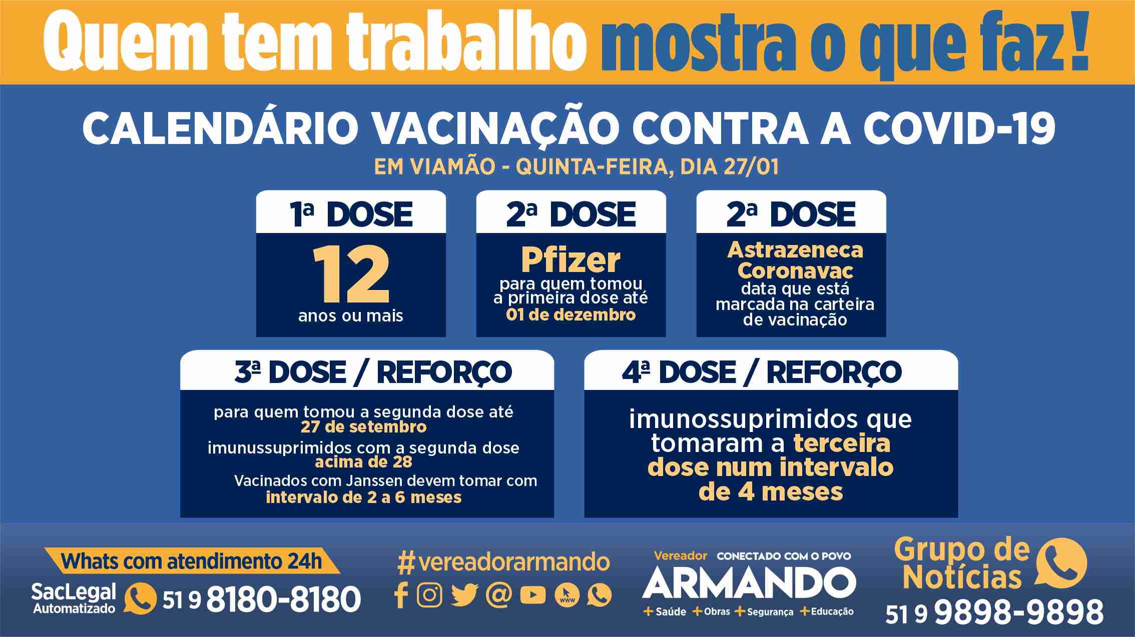 Inicial / #VereadorArmando / Nesta quinta-feira tem vacinação contra a COVID, nos 18 postos de saúde de Viamão!